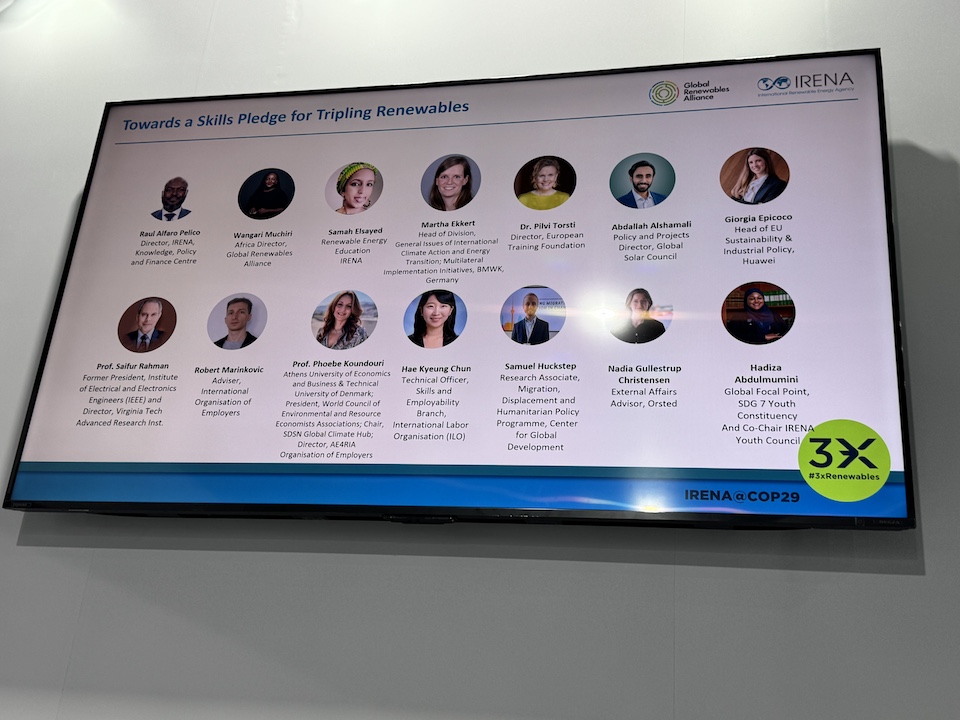 The side event discussed the pathway to achieving the global goal of tripling renewable electricity capacity by 2030. This will demand a skilled workforce. Investing in education and training will therefore be vital for equipping the current and future workforce, including women and the youth, with the skills and competences needed to take advantage of the opportunities of the net zero economy. The panelists at this session highlighted how to approach governments, industry, associations, education and training providers, labour groups, civil society and international organizations to discuss a new call to action on skills development for the renewables-based energy transition.